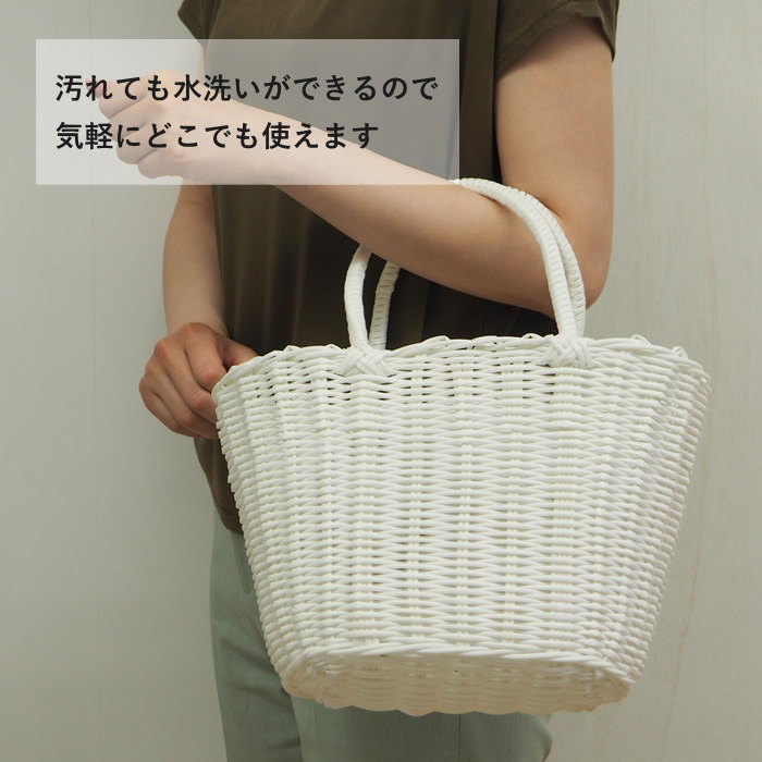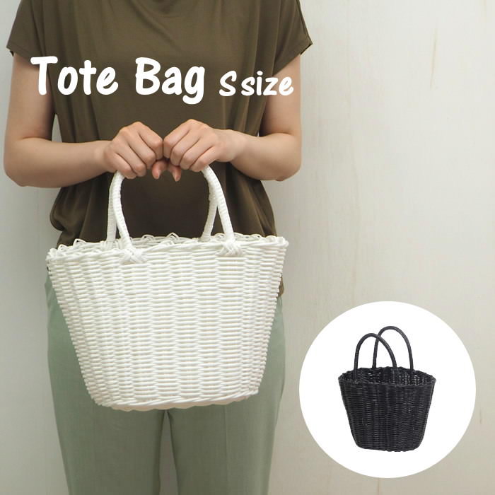 お出掛け・収納・インテリアにぴったり◎ ビニールのかごバッグ PPトートバッグ(L) Black はこちら ・Spec 商品名 PPトートバッグ(S) 素材 ポリプロピレン サイズ w約31cm×d約16cm×h約21(持ち手部分含め34)cm 約230g 備考 ※サイズや色合いなど多少の個体差が生じ、画像と実物が異なる場合がございます。