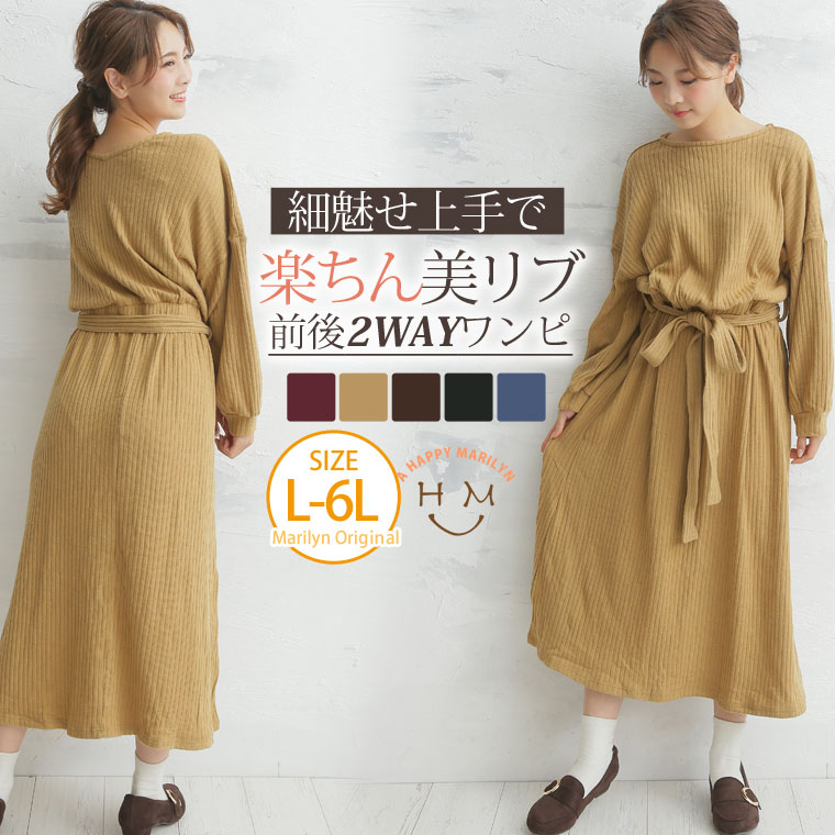 【限定!全品P5倍8/31 13:59まで】 大きいサイズ レディース ワンピース | ぽわん袖 2WAY 共ベルト付き 長袖 ロング丈 ニットワンピース _ オリジナル ワンピース ワンピ ニットワンピ LL 3L 4L 5L 6L ぽっちゃり ゆったり 可愛い お腹 二の腕 腰周り [431788] 春 春物 春服