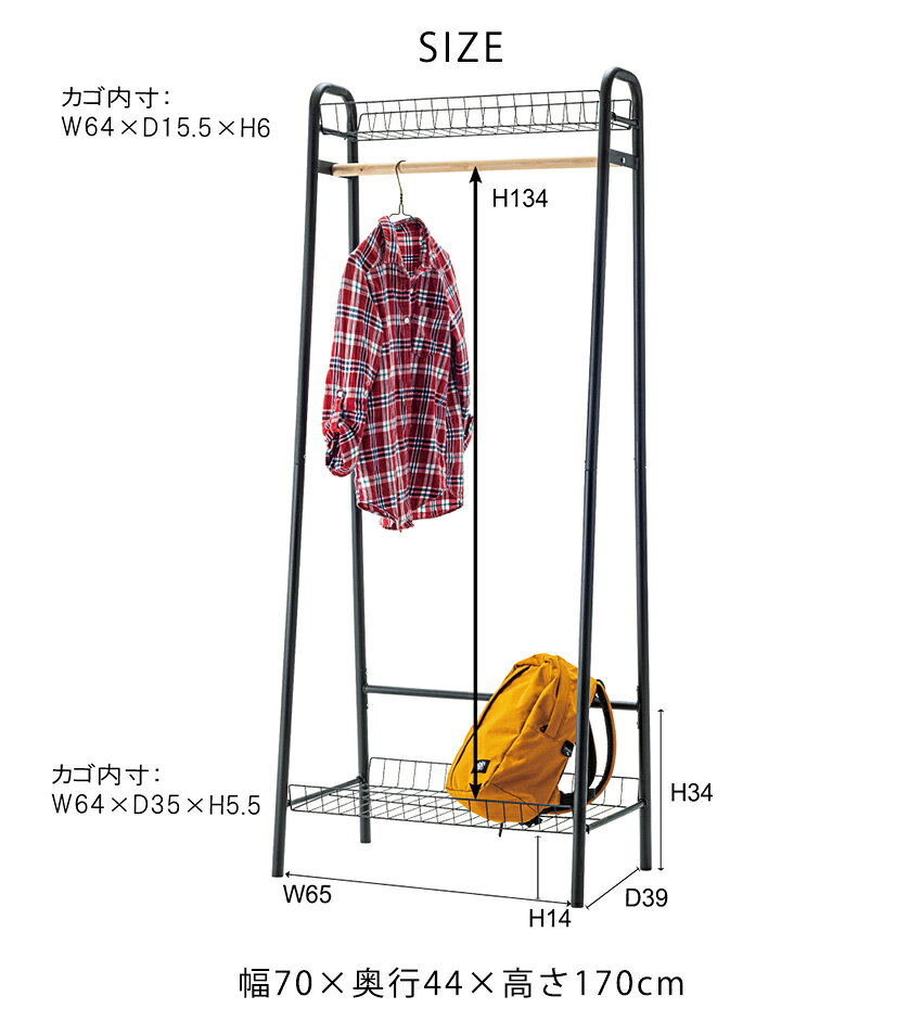 ロングコートもしっかりと収納できます ■上段の棚には帽子やポーチ、ハンドバックなど小さめの物を置くのにピッタリ ■下段の棚には収納BOXやカバンなど大きめの物を置くのに最適 ■床から下棚の隙間は約14cmなので、薄型収納BOXも置けて便利 ■ポールは天然木(ビーチ)を使用。